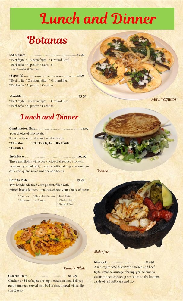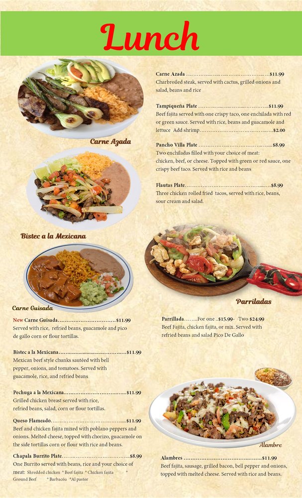 3 tacos of marinated in guajillo sauce lightly fried served with grilled onions and jalapenos and beans.